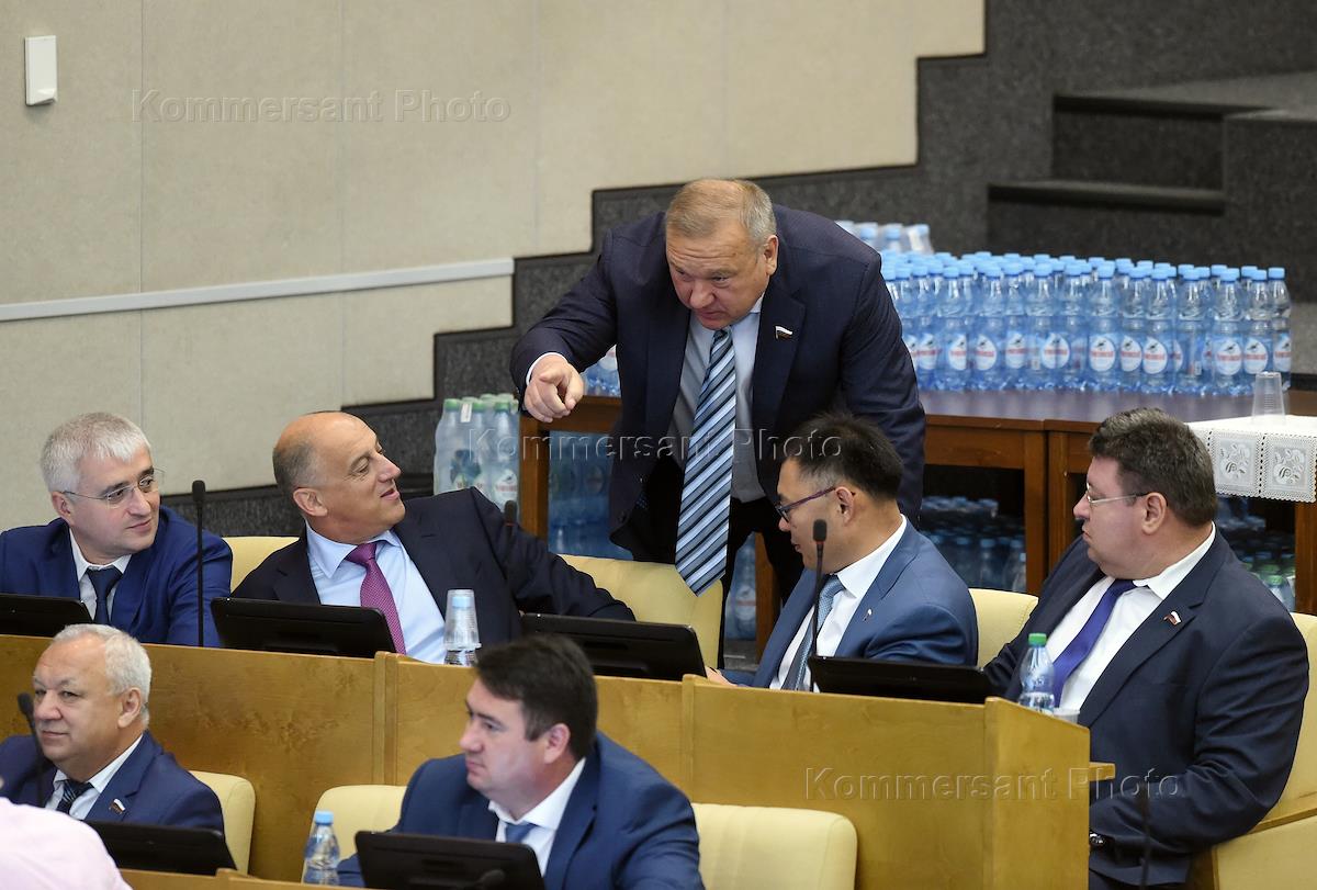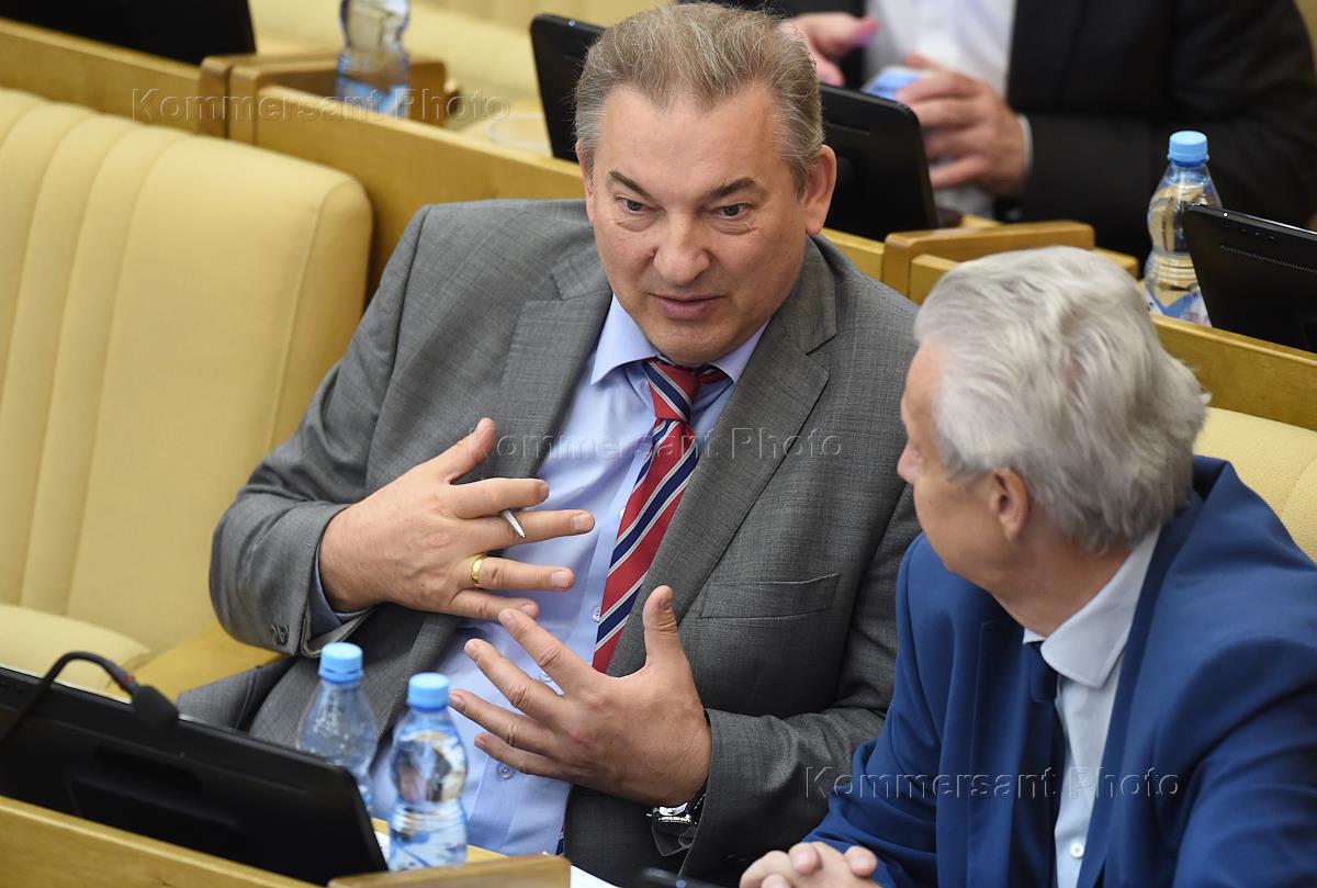 Plenary session of Russia's State Duma.The First Deputy Chairman of state Duma Committee on constitutional legislation and state construction Vyacheslav Lysakov (left) before the meeting.