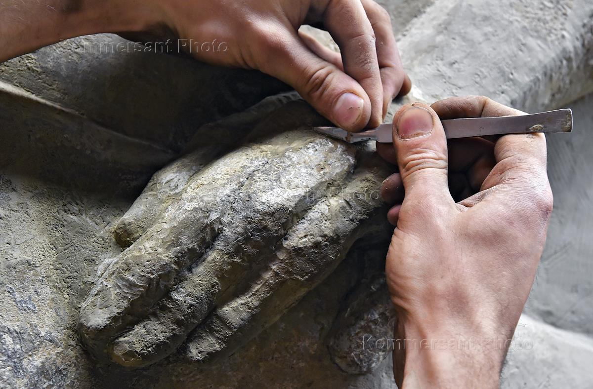 Реставрация исторических барельефов декора стадиона "Динамо" скульптора Сергея Меркурова. Реставратор во время работы.
