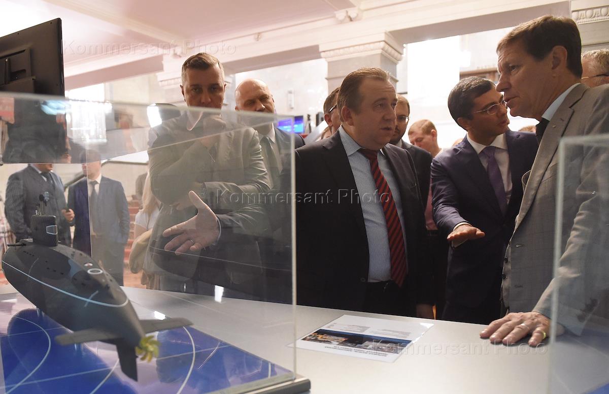 Выставка фотографий и моделей кораблей, посвященная 350-летию отечественного государственного судостроения и 10-летию учреждения акционерного общества «Объединенная судостроительная корпорация» (ОСК) открылась в Государственной думе России. Президент Объединенной судостроительной корпорации (ОСК) Алексей Рахманов (в центре) и первый заместитель председателя ГД России Александр Жуков (справа) во время открытия выставки.