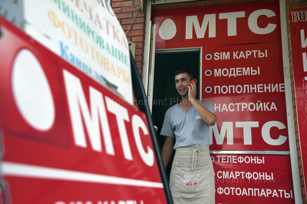 Жанровая фотография. Мужчина с мобильным телефоном возле офиса сотового оператора МТС.