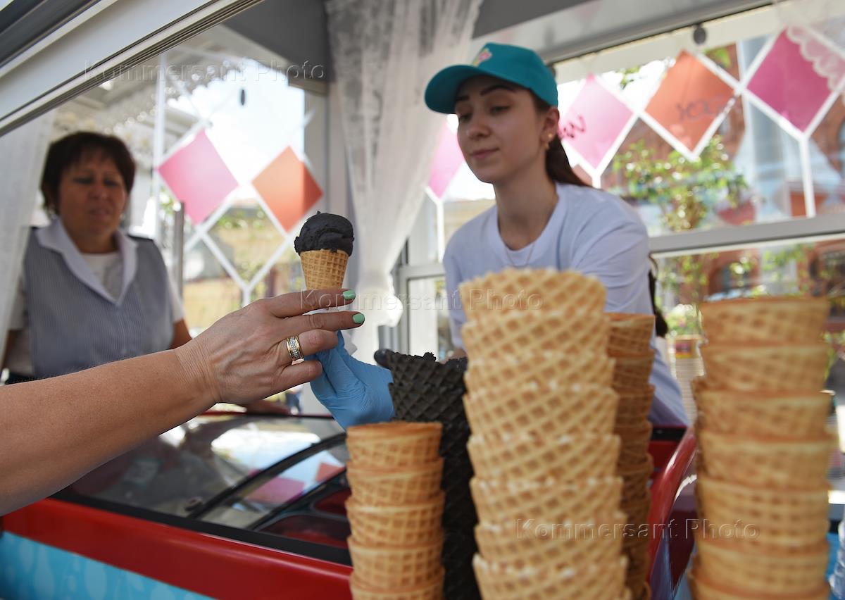 Фестиваль "Московское лето. Цветочный джем" на Площади Революции. Торговая палатка по продаже мороженого.