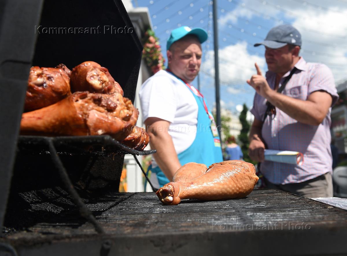 Фестиваль "Московское лето. Цветочный джем" на Площади Революции. Торговая палатка по продаже свиных копченых рулек.