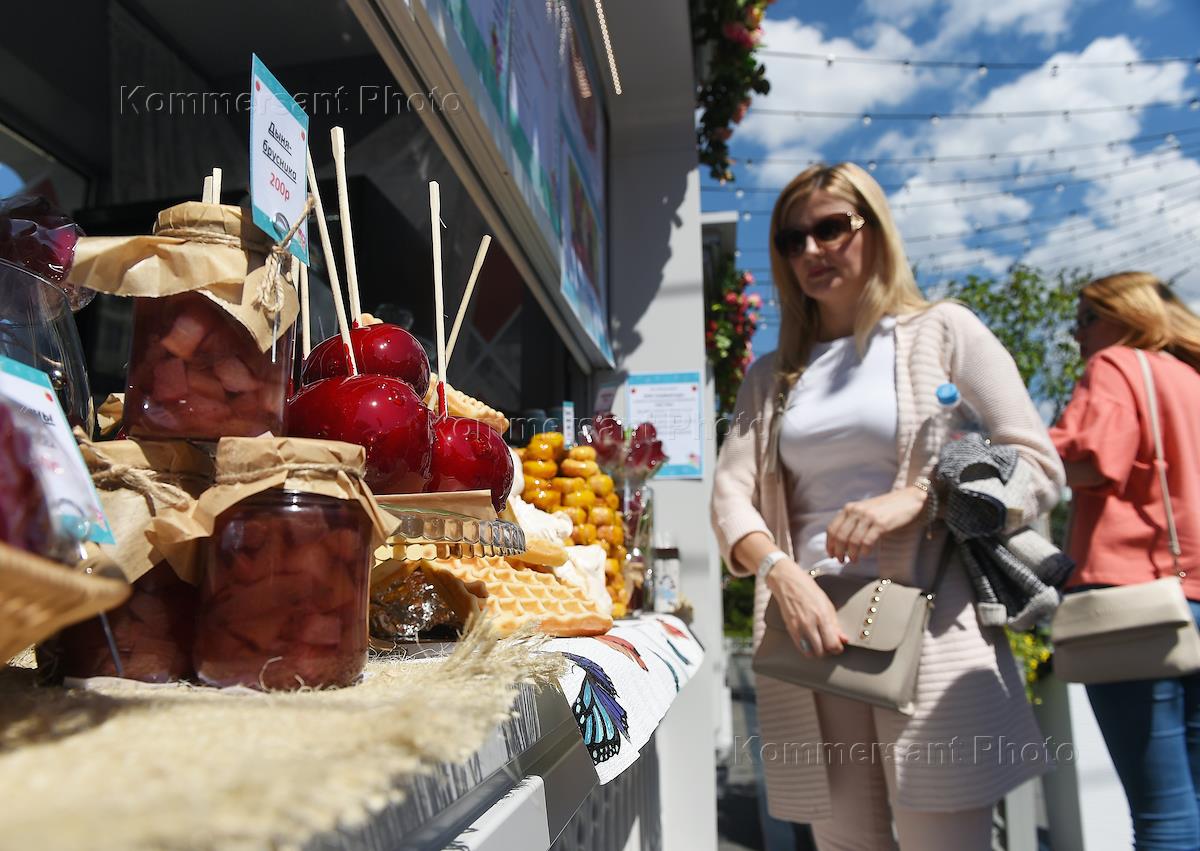 Фестиваль "Московское лето. Цветочный джем" на Площади Революции. Торговая палатка с вареньем и сладостями.