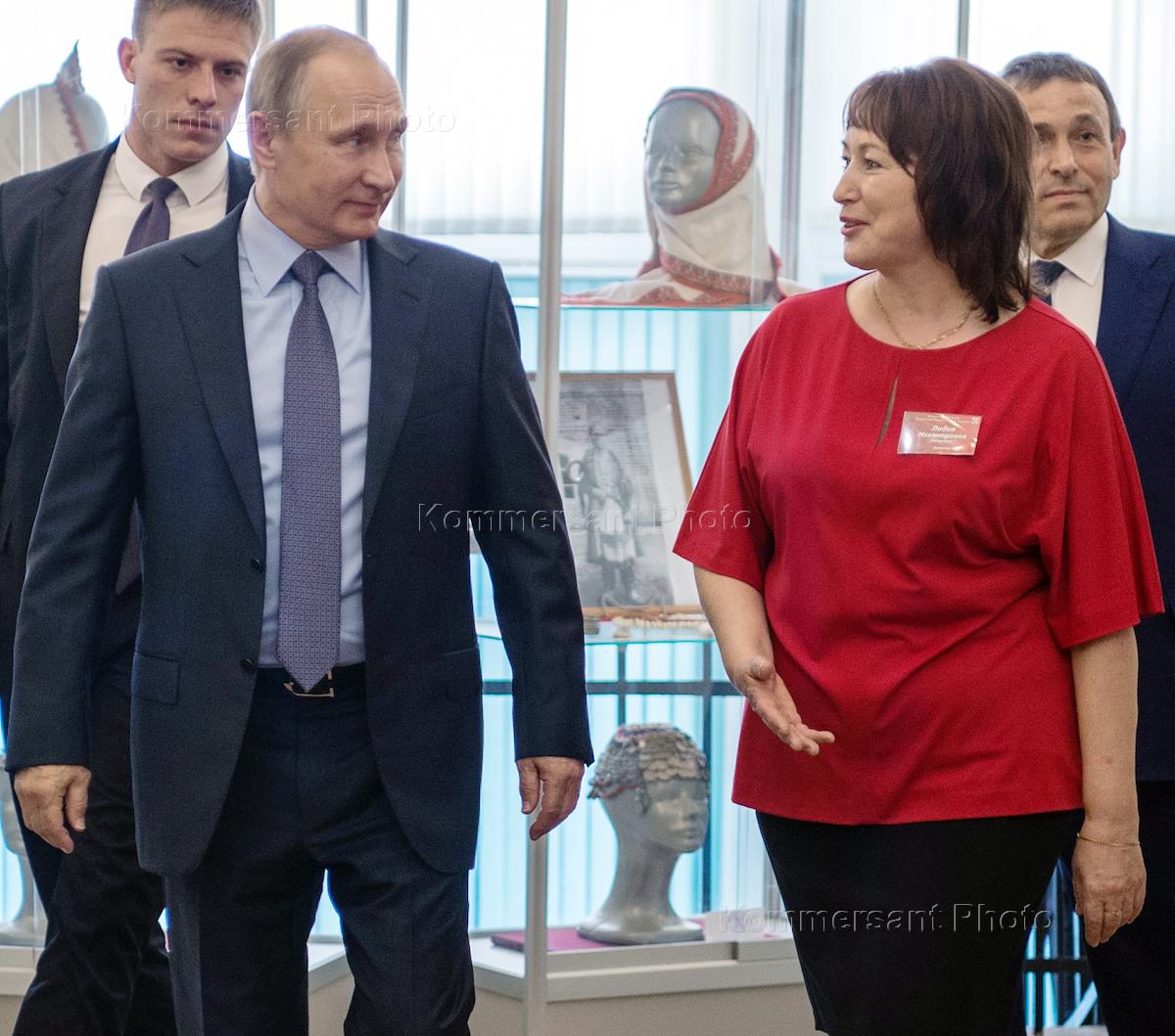 Президент России Владимир Путин (слева) и директор Национального музея Республики Марий Эл имени Т. Евсеева Лидия Смирнова (справа) во время посещения музея.