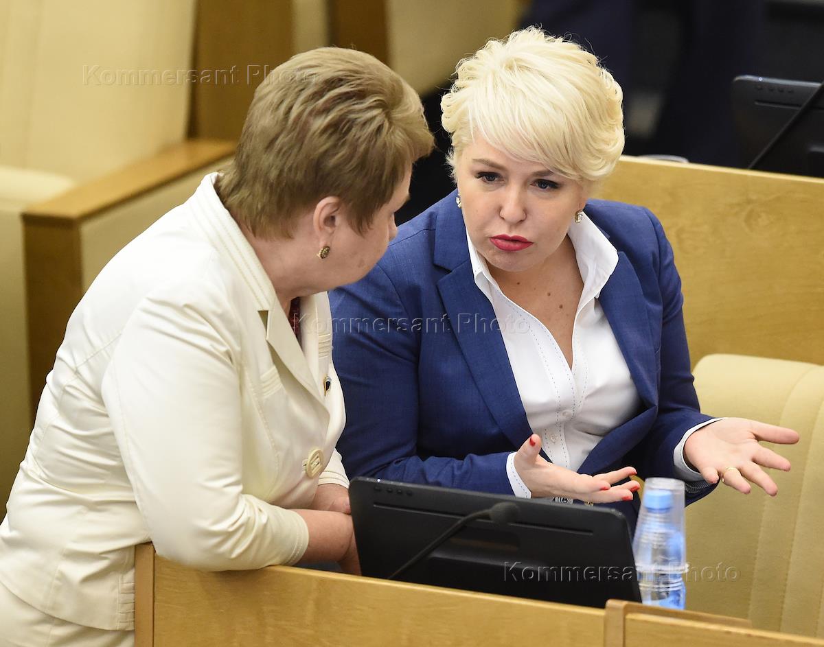 Пленарное заседание Государственной думы (ГД) России. Последнее заседание весенней сессии. Заместитель председателя ГД России Ирина Яровая (слева) и член комитета ГД России по труду, социальной политике и делам ветеранов Андрей Исаев (справа) во время заседания.