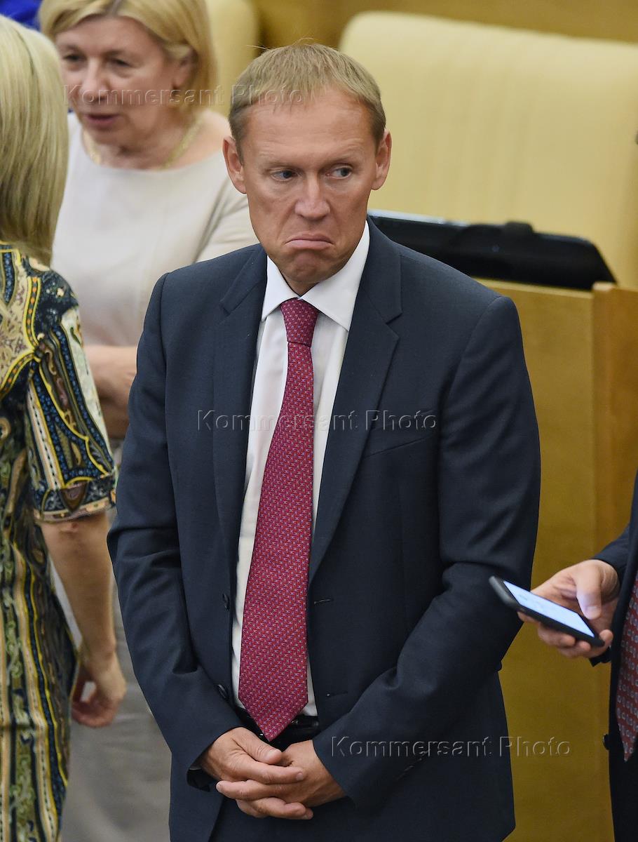Пленарное заседание Государственной думы (ГД) России. Последнее заседание весенней сессии. Член комитета ГД России по экономической политике, промышленности, инновационному развитию и предпринимательству Александр Максимов (в центре) перед началом заседания.