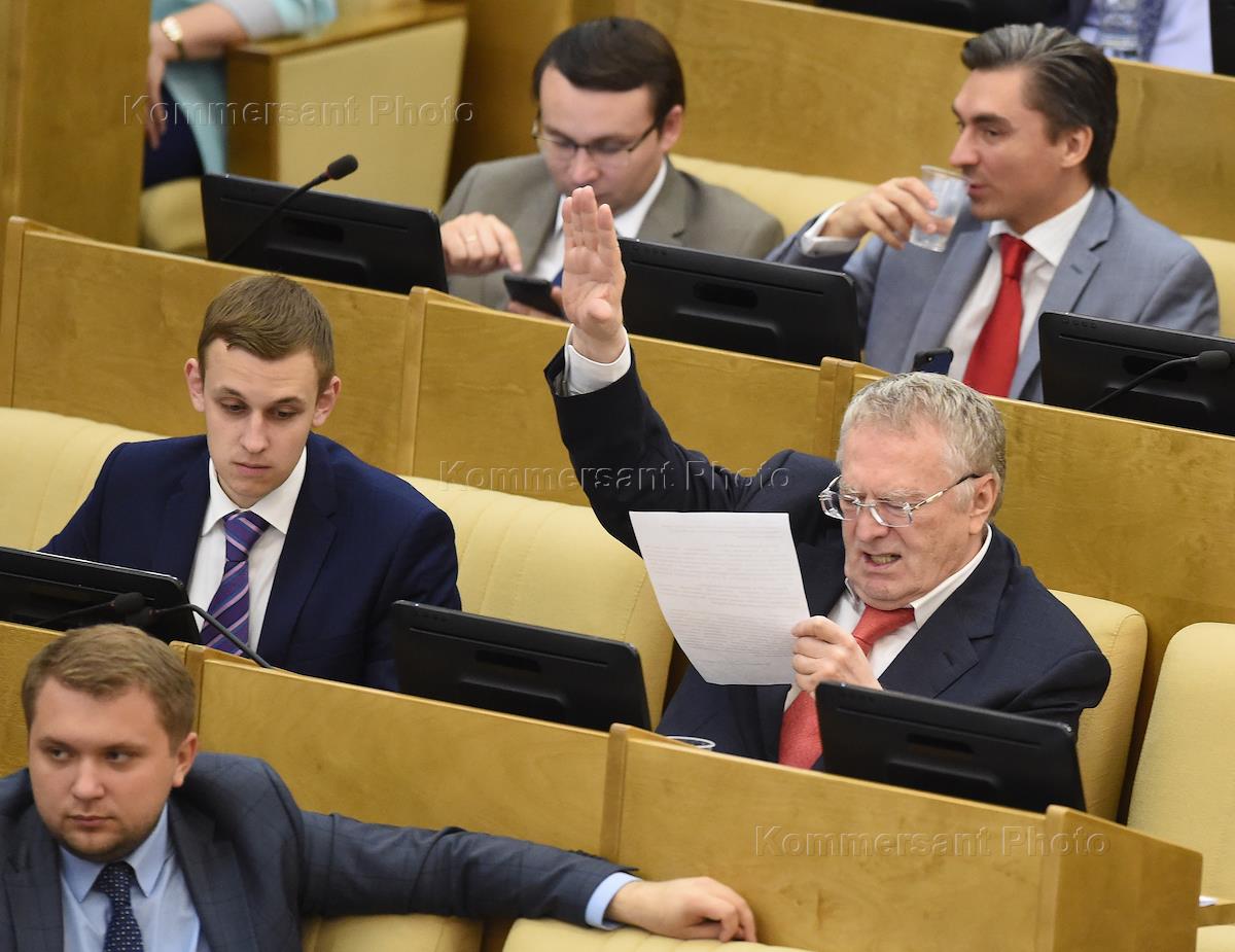 Пленарное заседание Государственной думы (ГД) России. Последнее заседание весенней сессии. Лидер Либерально-демократической партии России (ЛДПР) Владимир Жириновский (в центре) во время заседания.