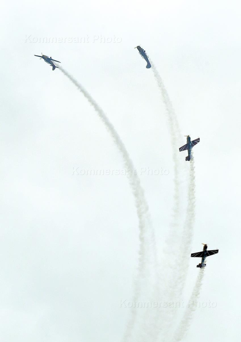 Международный авиационно-космический салон МАКС-2017 прошел на аэродроме в Жуковском. Пятый день работы авиасалона. Пилотажная группа "CHELAVIA TEAM", выступающая на легких однодвигательных самолетах Tecnam Sierra P2002.
