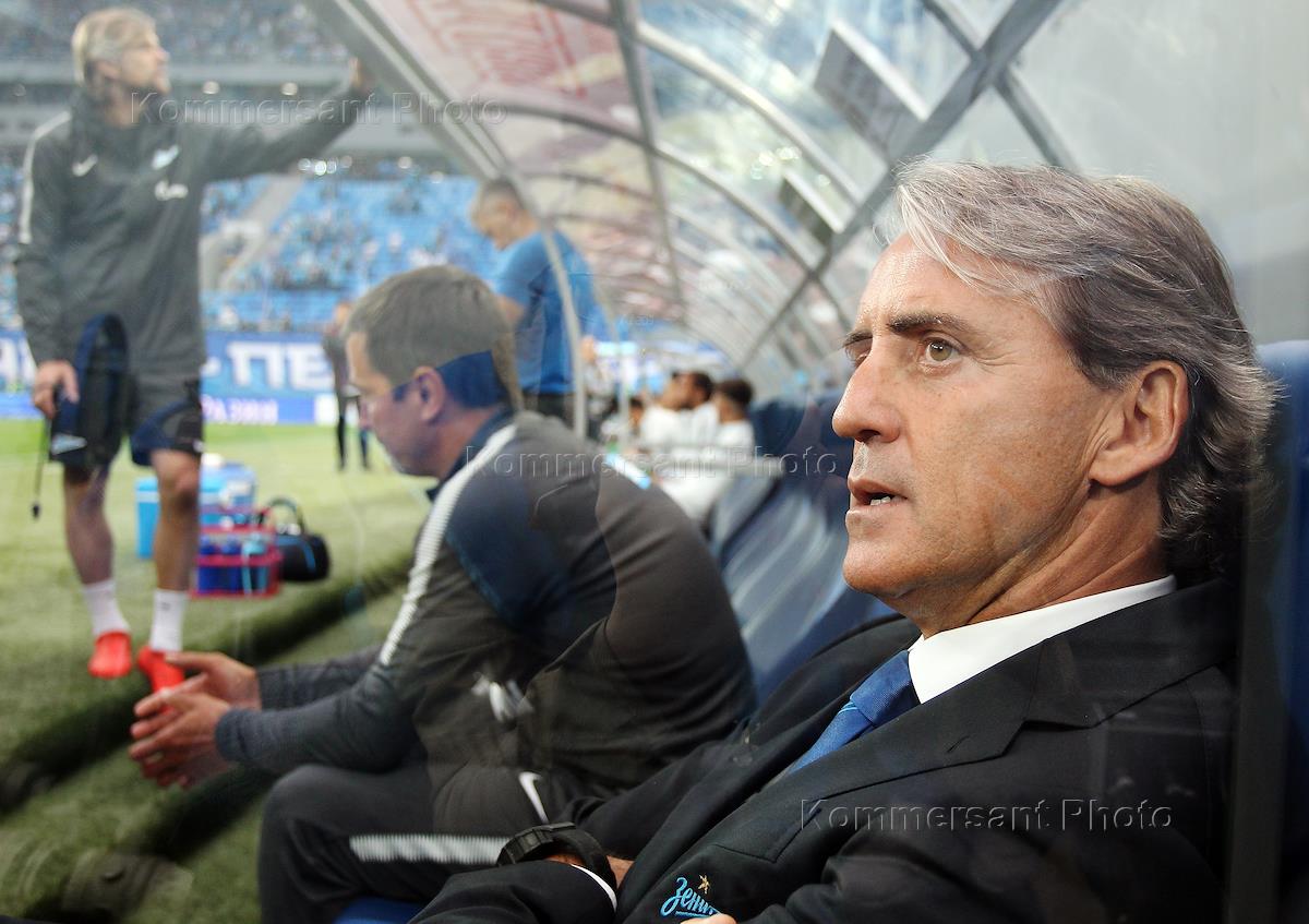 Чемпионат России по футболу. Матч между командами "Зенит" (Санкт-Петербург) и "Рубин" (Казань) прошел на стадионе "Санкт-Петербург". Главный тренер команды "Зенит" Роберто Манчини (слева) во время матча.