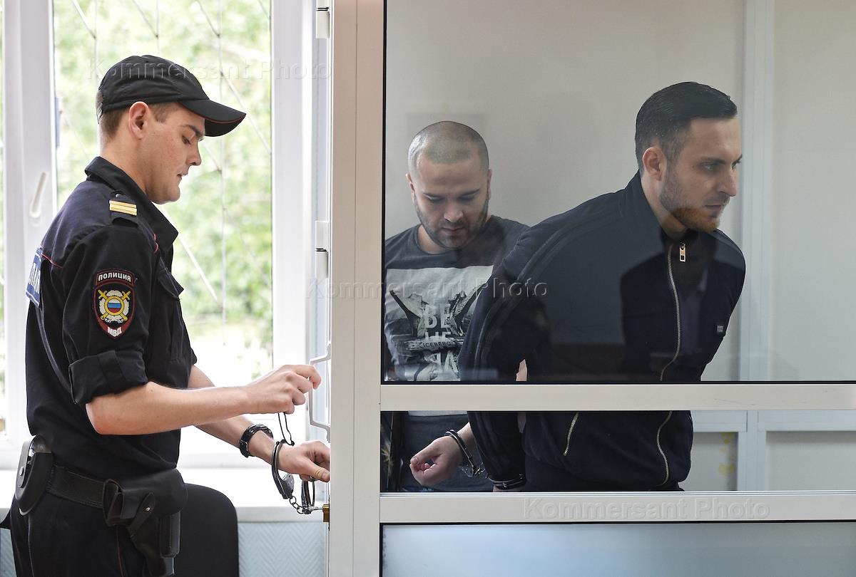 Обвиняемые по делу о мошенничестве на 5 млн. рублей бывшие сотрудники управления ФСБ по Москве и Московской области Карен Краюхин (второй слева) и Владислав Новиков (второй справа) перед заседанием в Московском гарнизонном военном суде.