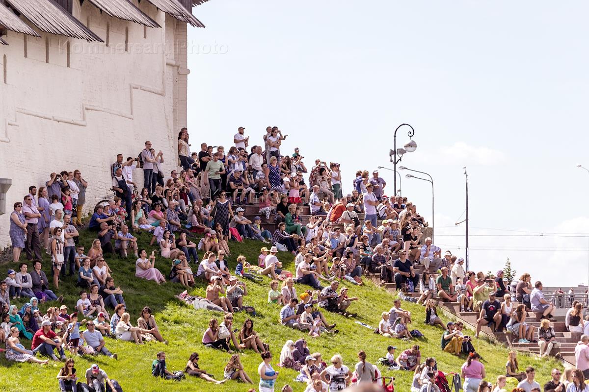 The World Cup Stage in sports aerobatics Red Bull Air Race 2017. The viewers of the Championship near the walls of Kazan Kremlin.