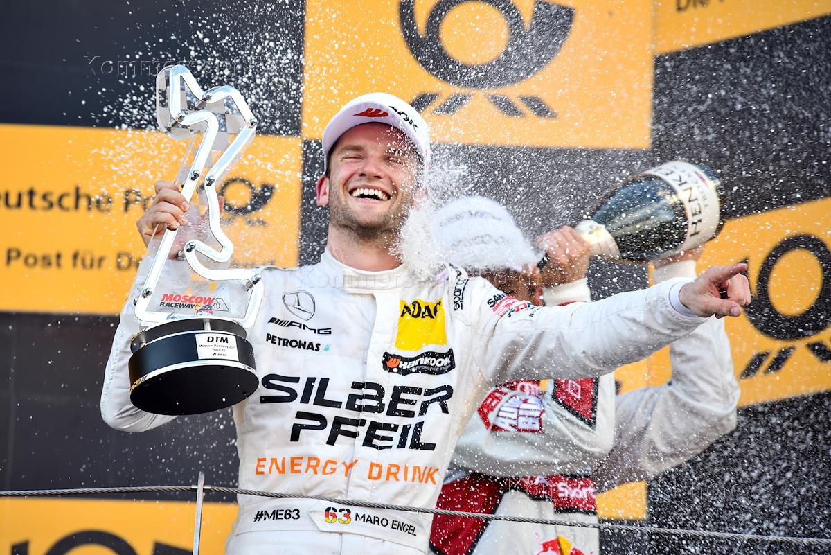 Российский этап гоночной серии DTM на автодроме Moscow Raceway. Пилот команды Mercedes Маро Энгель (Германия), завоевавший первое место, во время церемонии награждения.