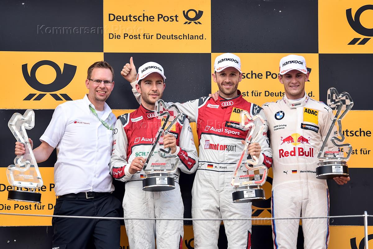 DTM racing series Russian stage at Moscow Raceway. Audi team pilot Matthias Ekstroem (Sweden) who won the second place during the award ceremony.