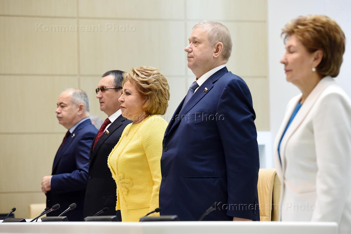 Пленарное заседание Совета Федерации (CФ) России, завершающее весеннюю сессию. Слева направо: заместитель председателя СФ России Ильяс Умаханов, первый заместитель председателя СФ России Николай Федоров, председатель СФ России Валентина Матвиенко, заместители председателя СФ России Евгений Бушмин и Галина Карелова во время заседания.