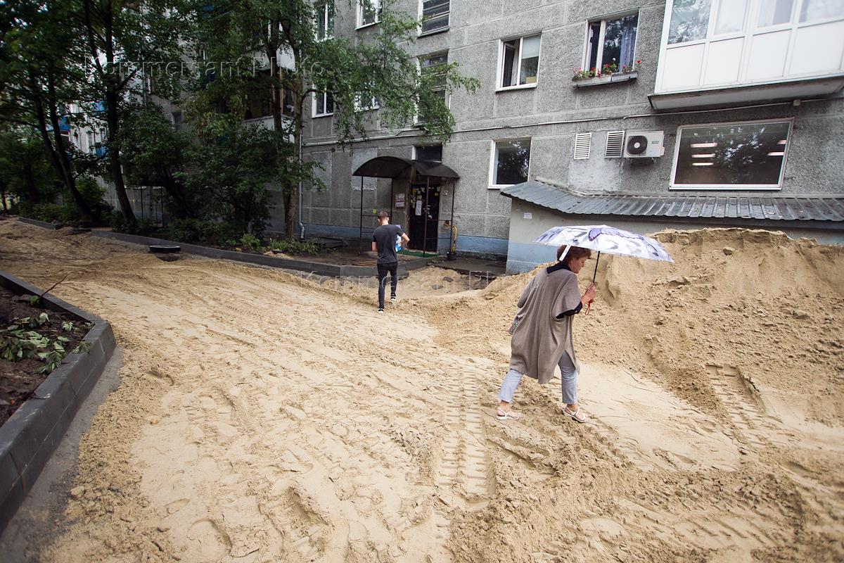 Жанровая фотография. Ремонтные работы во дворах города. песок на дороге.