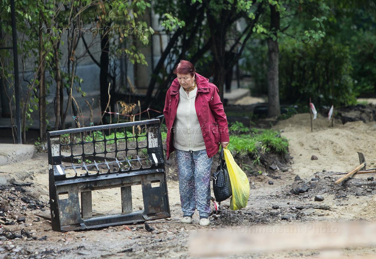 Жанровая фотография. Ремонтные работы во дворах города. Пожилая женщина идет по разбитой дороге.