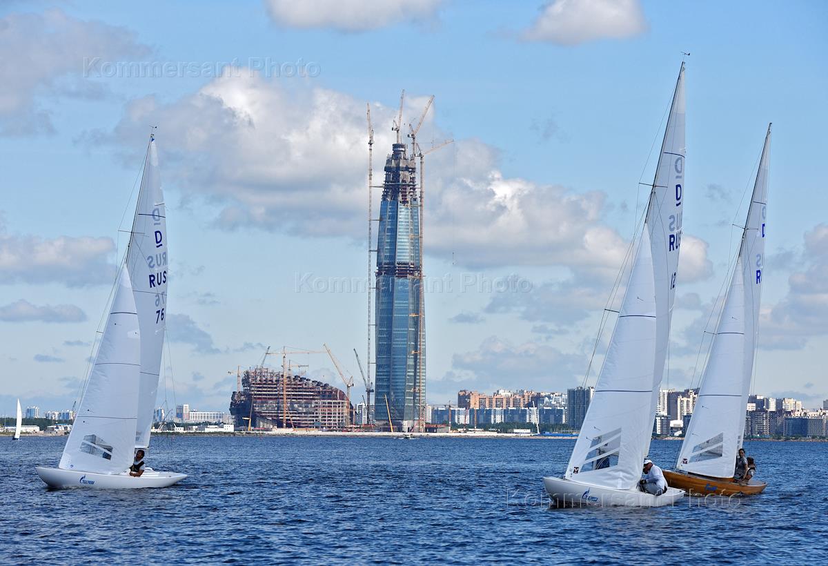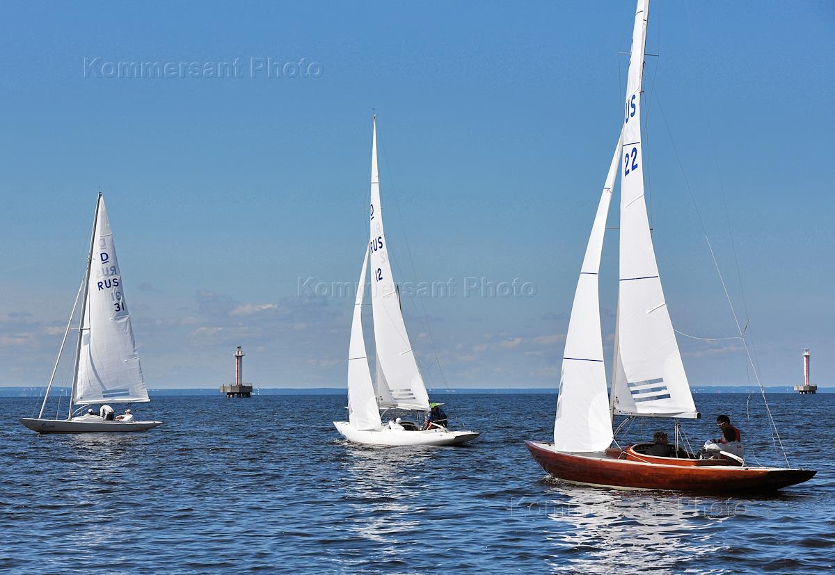 Участники Открытого чемпионата России по парусному спорту в классе яхт "Дракон" в Финском заливе в районе Лахты – на базе Яхт-клуба Санкт-Петербурга.