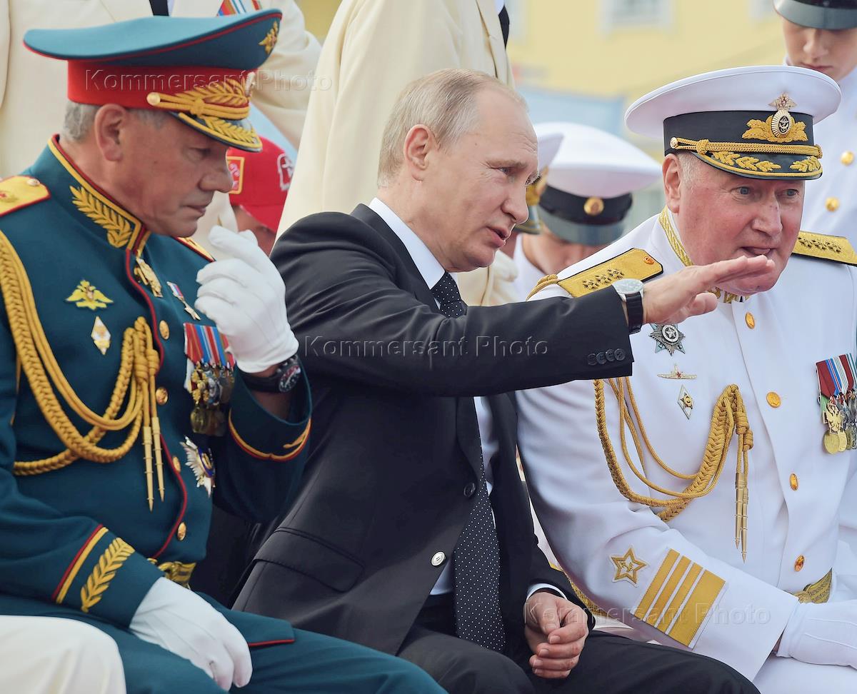 Russian president Vladimir Putin's work trip to Saint Petersburg. The Naval Parade dedicated to the Day of the Navy of Russia. From left to right: Russian Defense Minister Sergei Shoigu, president of Russia Vladimir Putin, commander of the Western Military District Andrey Kartapolov and commander-in-chief of the Russian Navy Admiral Vladimir Korolev and during the parade at the Admiralty embankment.