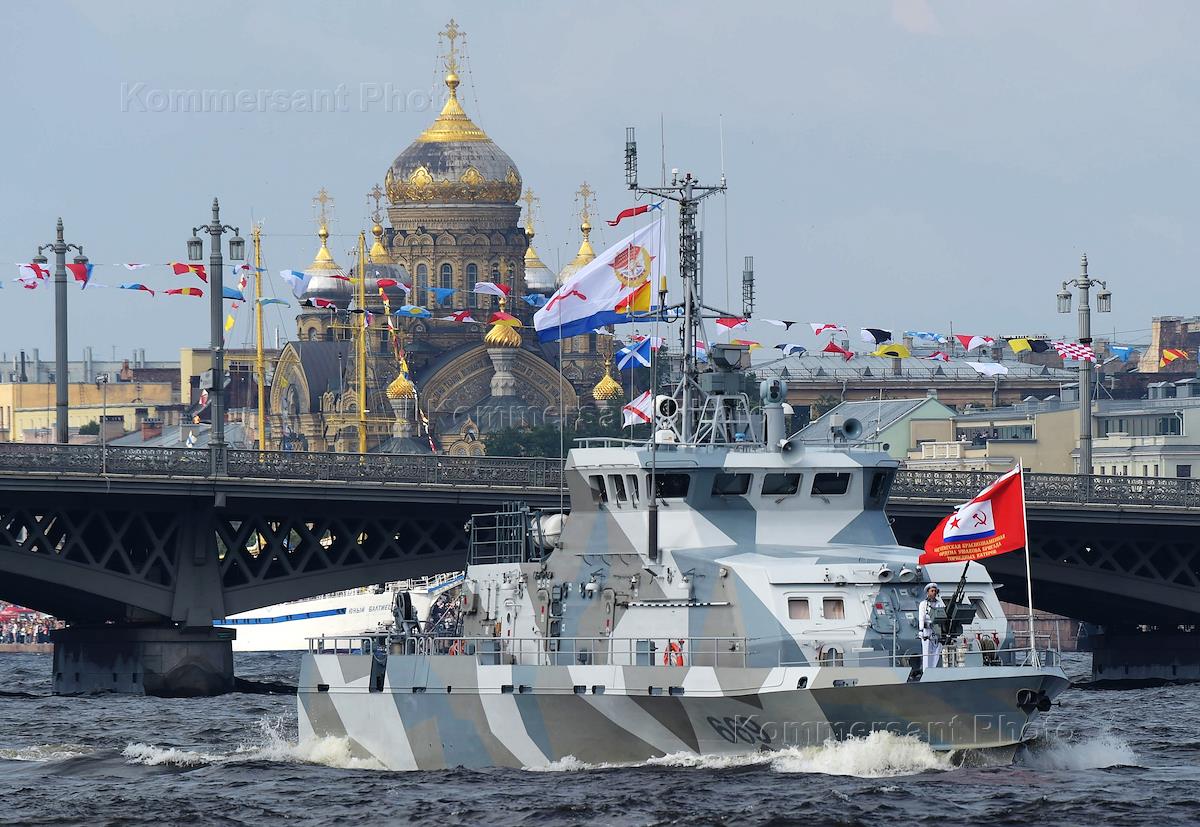 Рабочая поездка президента России Владимира Путина в Санкт-Петербург. Военно-морской парад, посвященный Дню Военно-морского флота (ВМФ) России. Малый ракетный корабль "Гейзер" в акватории реки Невы на параде.