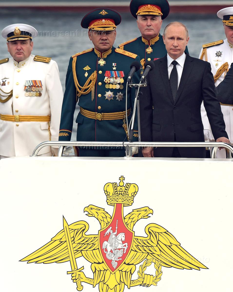 Рабочая поездка президента России Владимира Путина в Санкт-Петербург. Военно-морской парад, посвященный Дню Военно-морского флота (ВМФ) России. Слева направо: министр обороны России Сергей Шойгу, президент России Владимир Путин и главнокомандующий ВМФ России, адмирал Владимир Королев во время парада.