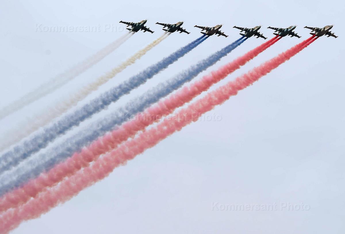 Russian president Vladimir Putin's work trip to Saint Petersburg. The Naval Parade dedicated to the Day of the Navy of Russia. Su-25 attack aircraft in the sky of the parade.