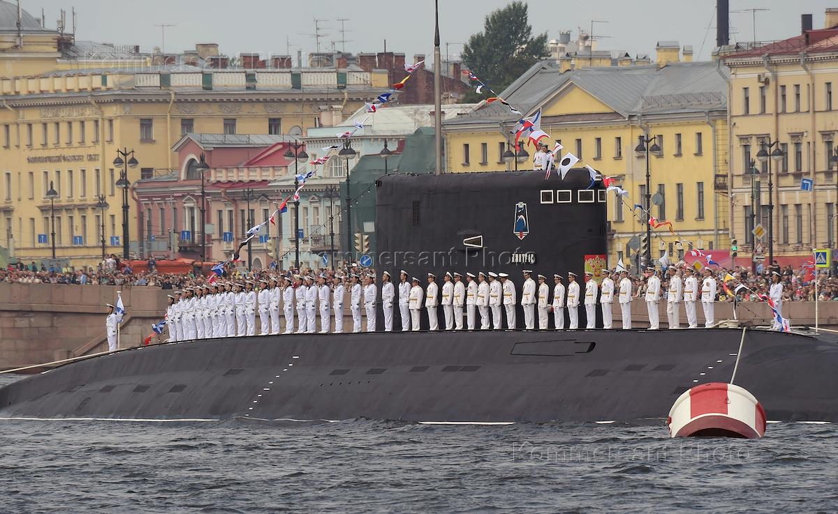 Рабочая поездка президента России Владимира Путина в Санкт-Петербург. Военно-морской парад, посвященный Дню Военно-морского флота России. Дизель-электрическая подводная лодка "Старый Оскол" во время парада.