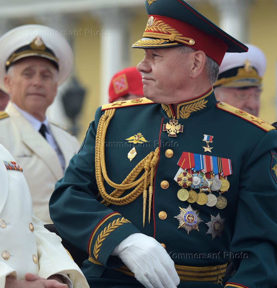 Russian president Vladimir Putin's work trip to Saint Petersburg. The Naval Parade dedicated to the Day of the Navy of Russia. Russian Defense Minister Sergei Shoigu during the parade at the Admiralty embankment.