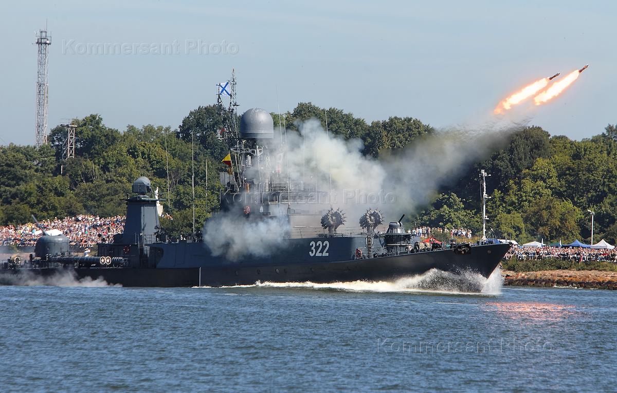 Военно-морской парад в честь Дня Военно-Морского флота России. Боевой корабль "Стерегущий" во время парада.