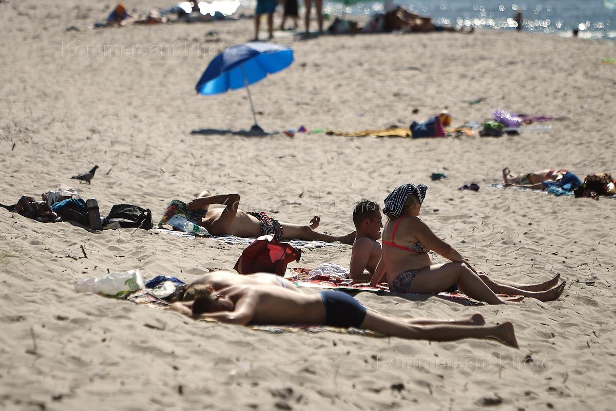 Военно-морской парад в честь Дня Военно-Морского флота России. Отдыхающие на пляже смотрят на проходящие корабли во время парада.