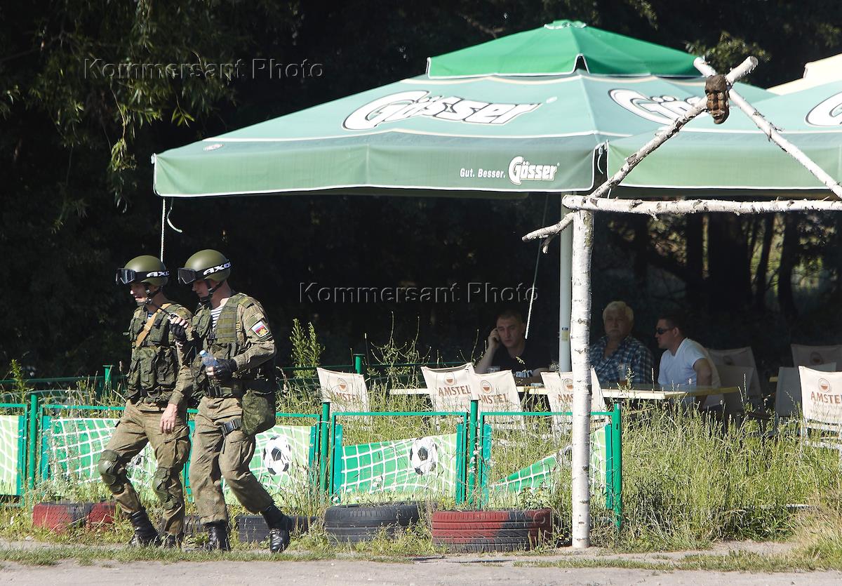 Жанровая фотография. Военнослужащие в касках идут по территории пляжа.