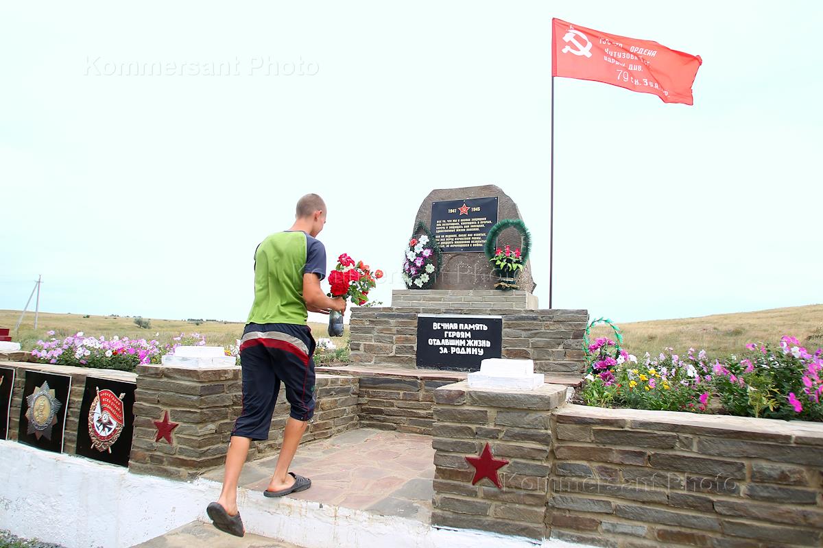 Сын фермера Александр Тищенко во время возложения цветов к мемориалу героям Великой Отечественной войны, построенного отцом.