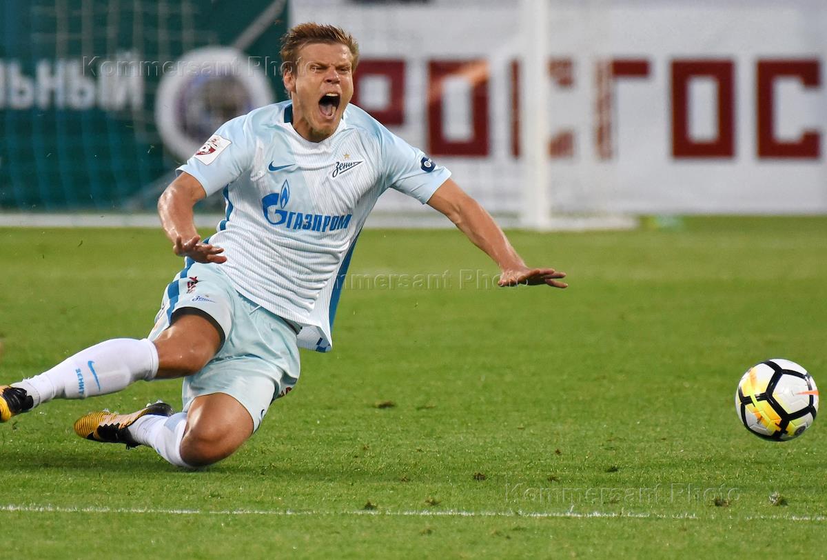 Чемпионат России по футболу 2017/2018, 3-й тур. Матч между командами "Тосно" (Ленинградская область) и "Зенит" (Санкт-Петербург) прошел на стадионе "Петровский". Игрок команды "Зенит" Александр Кокорин во время матча.
