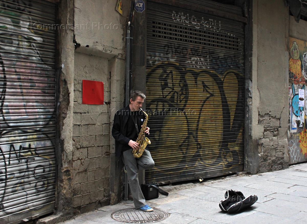 Виды Барселоны. Жанровая фотография. Уличный музыкант играет на саксофоне.
