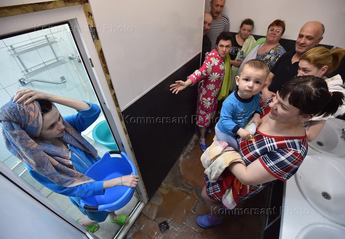 Аварийные пятиэтажные дома, не попавшие в программу реновации. Дом № 15 по улице Стрелецкой. Жительницы коммунальной квартире в общей комнате для умывания во время развешивания белья.