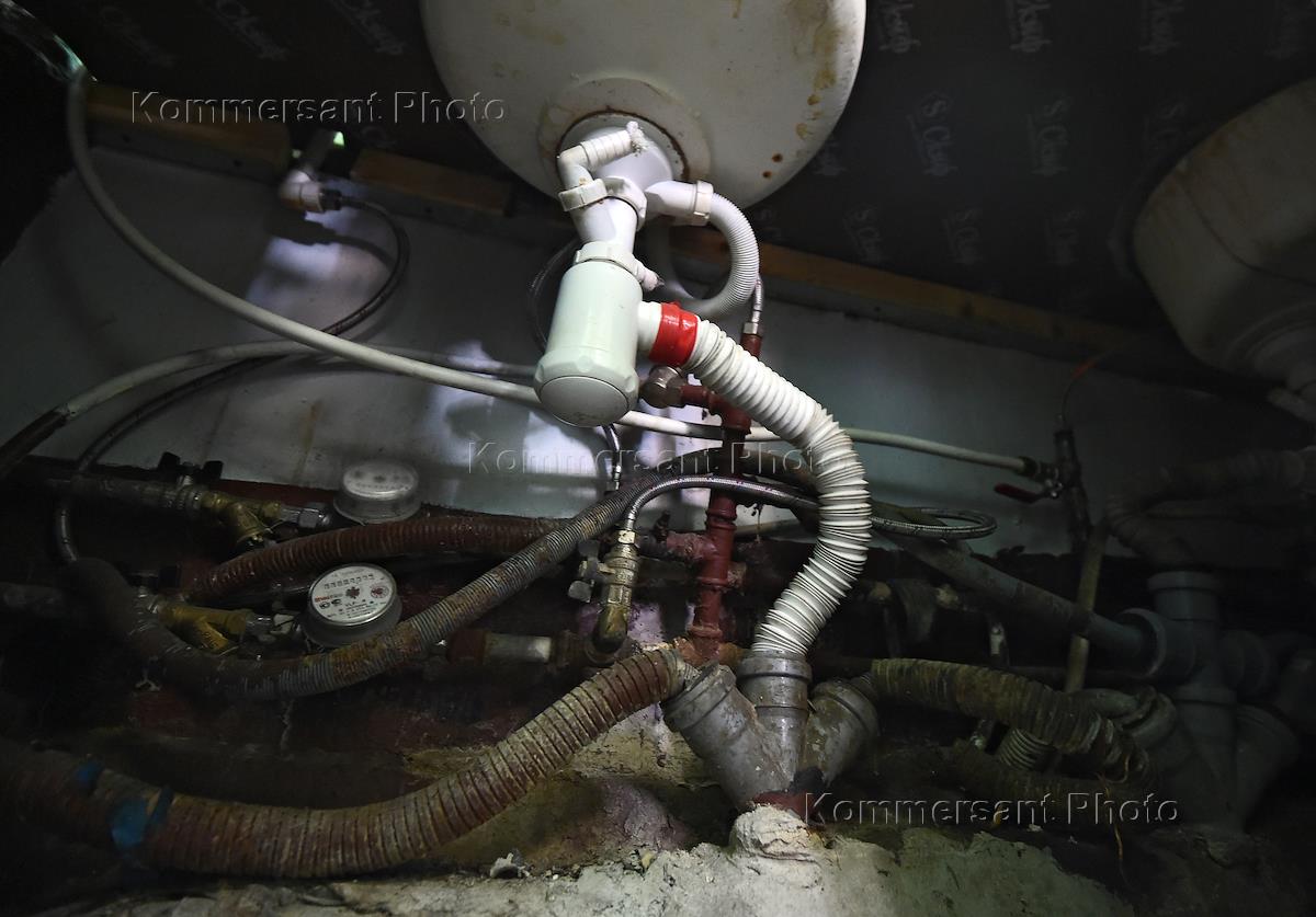 Аварийные пятиэтажные дома, не попавшие в программу реновации. Дом № 6 по улице Лобанова. Трубы коммунальной квартиры дома.