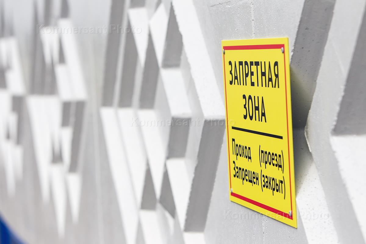 Осмотр хода строительства стадиона "Калининград", на котором пройдут матчи Чемпионата мира по футболу 2018 года, заместителем председателя правительства России Виталием Мутко. Жанровая фотография. Табличка "Запретная зона".