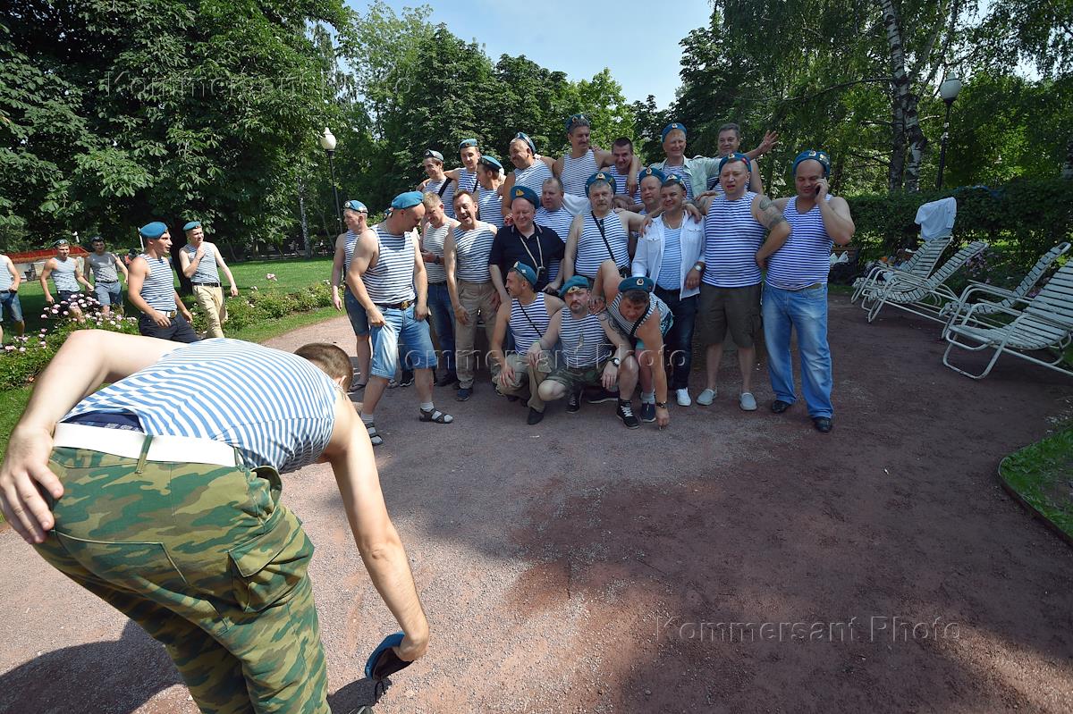Праздничные мероприятия, посвященные 87-й годовщине со дня образования Воздушно-десантных войск (ВДВ) России в Парке Горького. Бывшие военнослужащие ВДВ фотографируются на память.