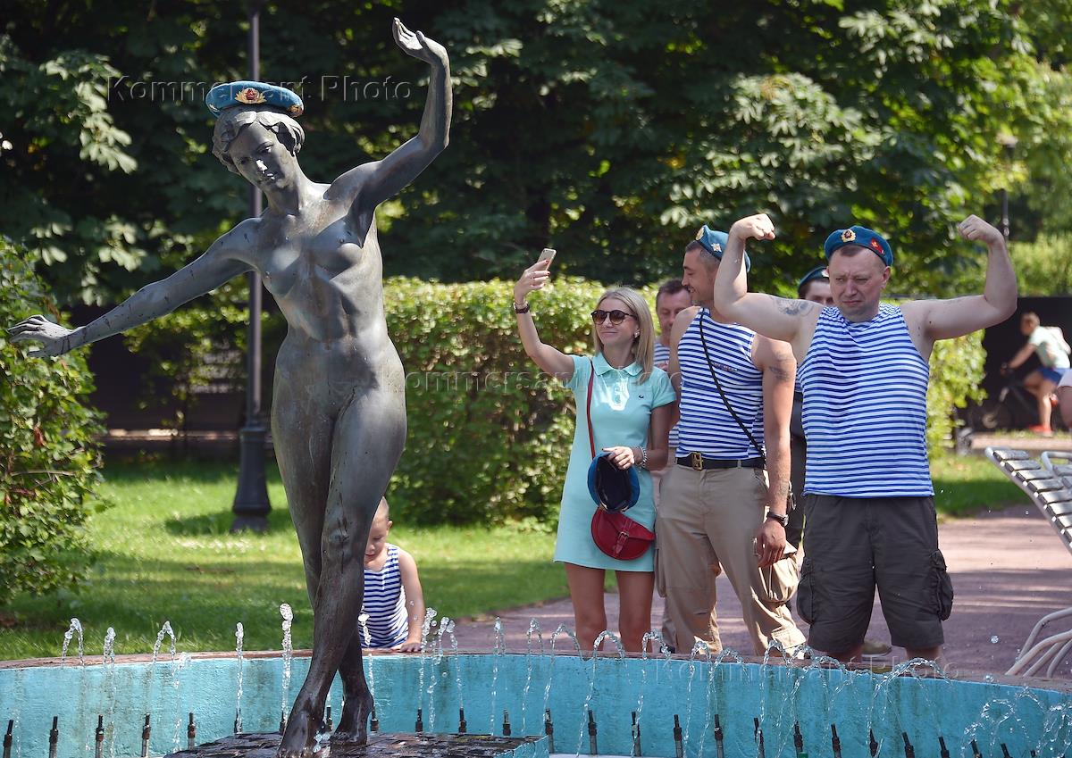 Праздничные мероприятия, посвященные 87-й годовщине со дня образования Воздушно-десантных войск (ВДВ) России в Парке Горького. Бывший военнослужащий ВДВ со своей семьей купается в фонтане парка.