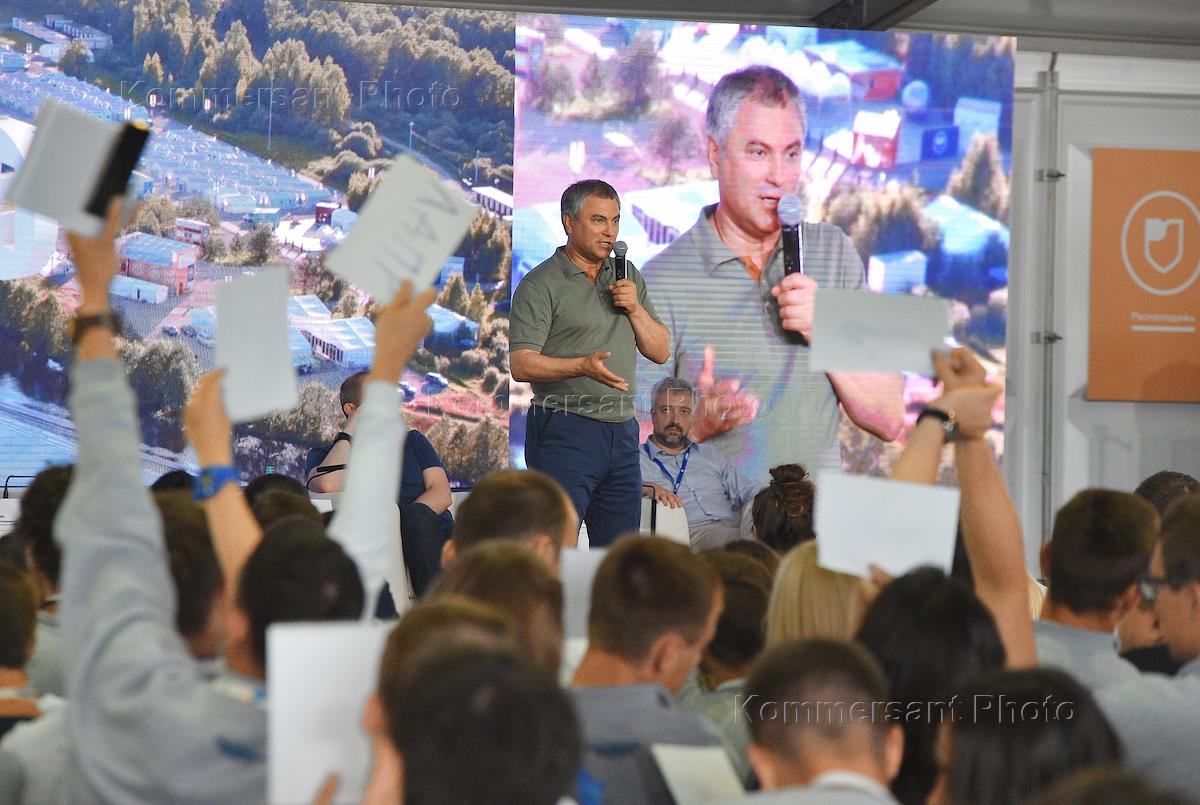 Всероссийский молодежный образовательный форум "Территория смыслов на Клязьме". Председатель Государственной думы России Вячеслав Володин во время выступления перед участниками форума.