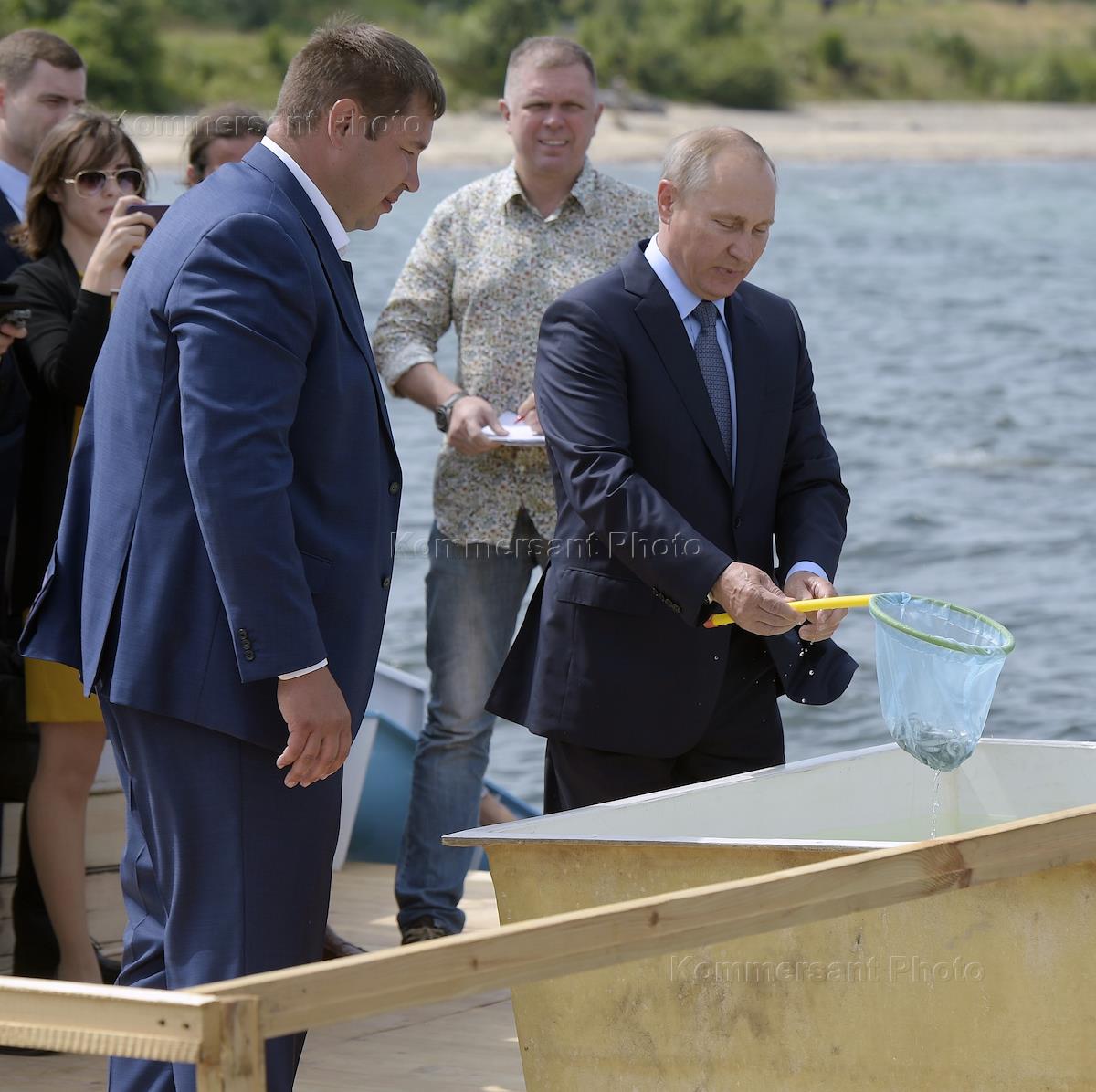 Working trip of Russian President Vladimir Putin to Buryatia. From right to left: Russian Minister of Natural Resources and Ecology Sergei Donskoy, Acting Head of the Republic of Buryatia Alexei Tsydenov, Russian President Vladimir Putin and Federal Protective Service officer Alexander Kurenkov after the ceremony of releasing juvenile omul into Baikal in the Baikal State Natural Biosphere Reserve.