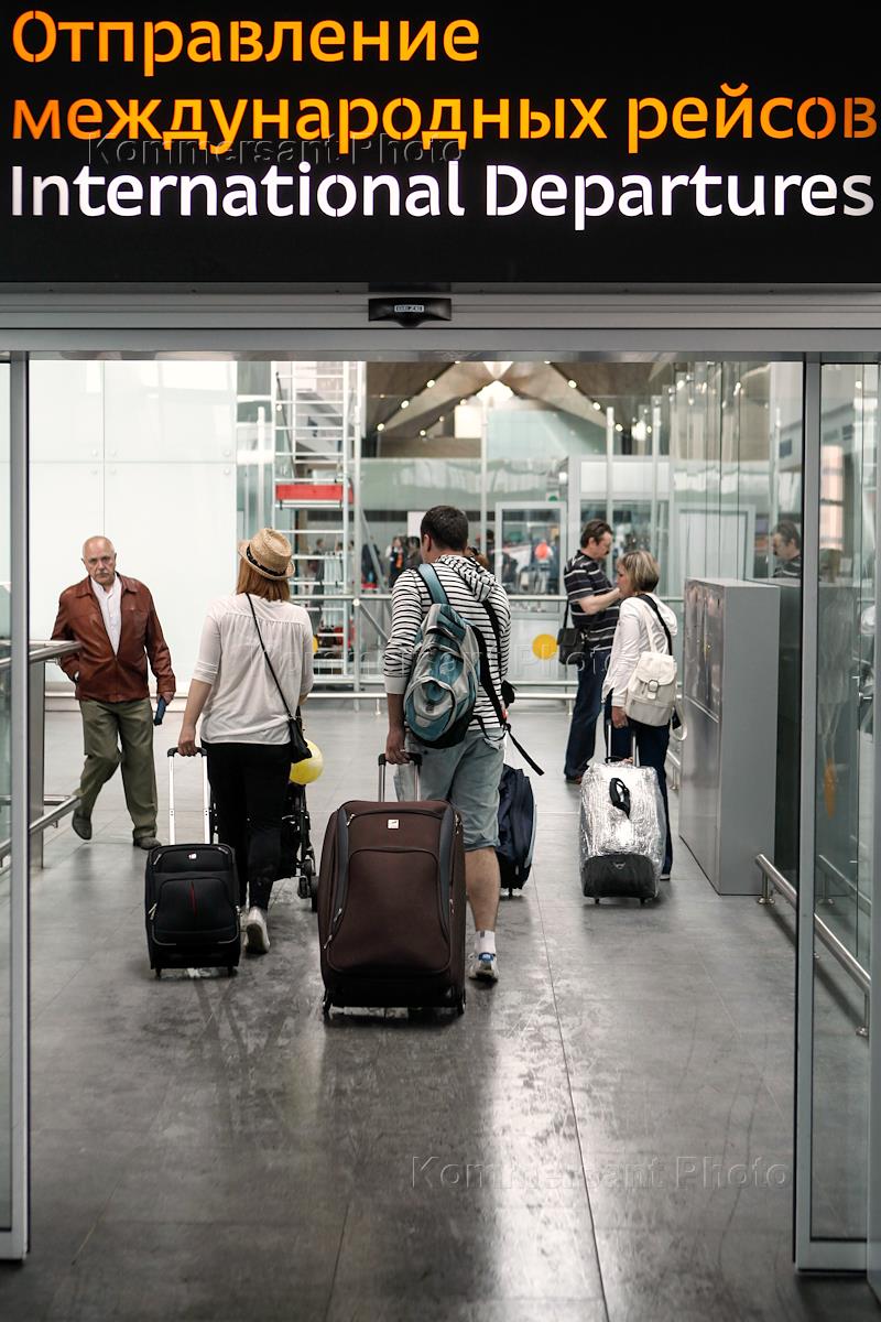 Аэропорт "Пулково". Пассажирский терминал. Пассажиры у входа в здание аэропорта в зоне отправления внутренних рейсов.