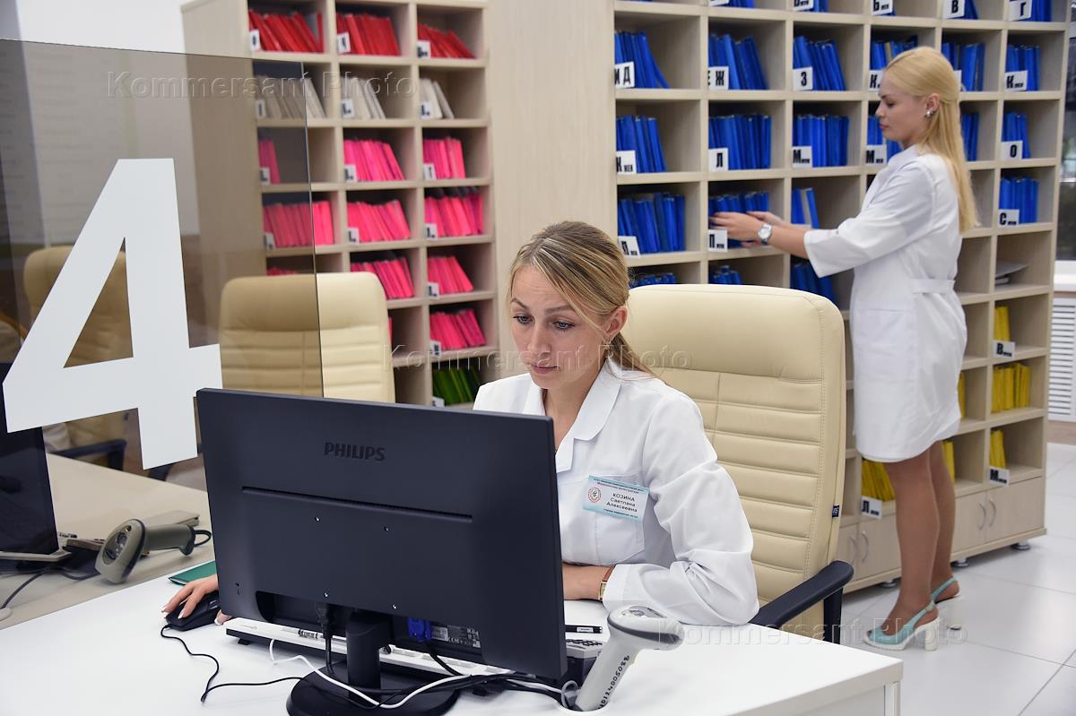 Работа поликлиники №1 Кировского клинико-диагностического центра, участвующей в федеральном пилотном проекте "Бережливая поликлиника". Регистратура.