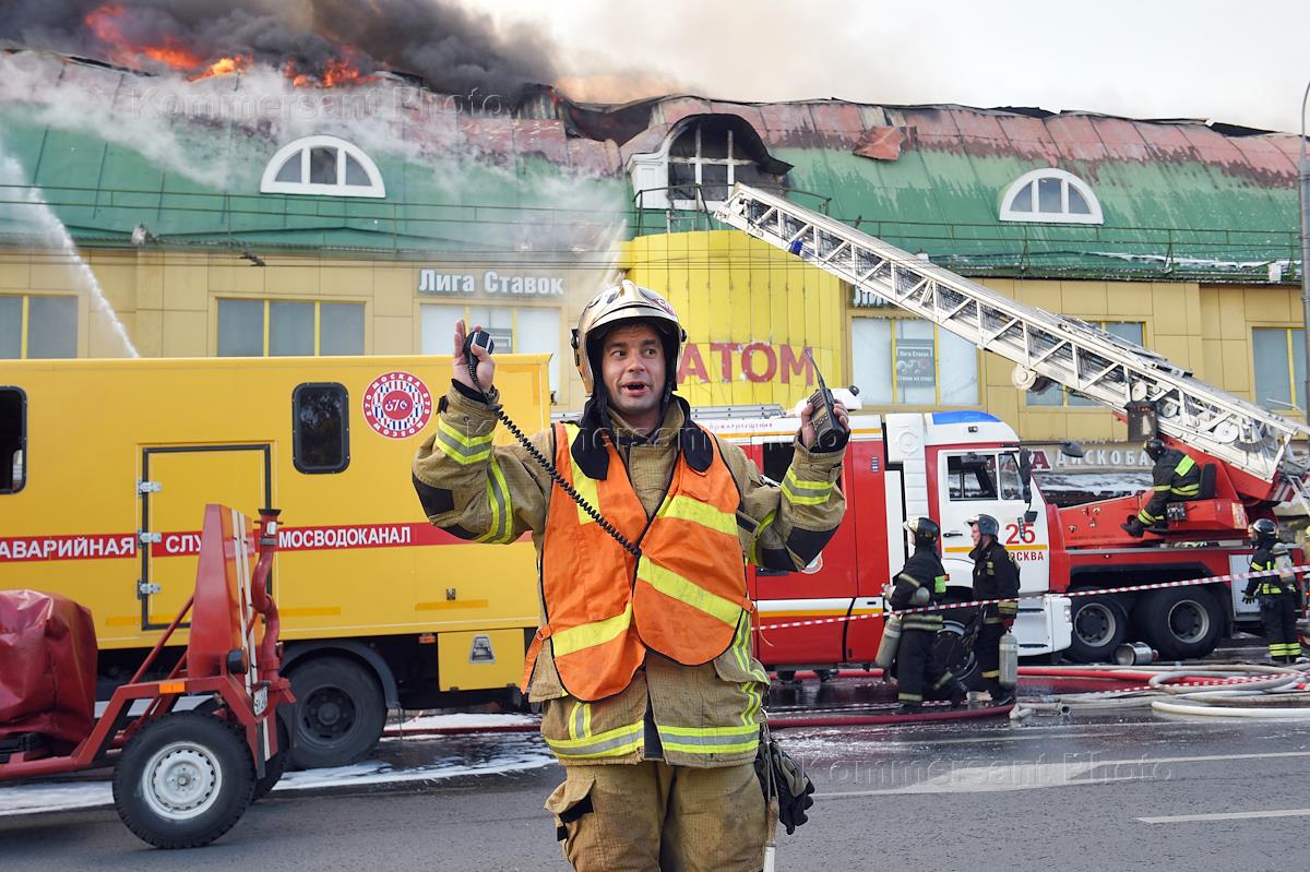 Пожар в торговом центре "Атом" на Таганской площади. Сотрудники МЧС во время ликвидации пожара.