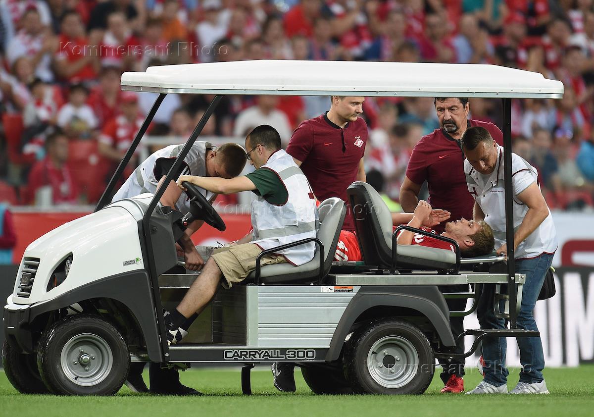 Чемпионат России по футболу 2017/2018. 5-й тур. Матч между командами "Спартак" (Москва) и "Арсенал" (Тула) прошел на стадионе "Открытие Арена". Сотрудники медицинской службы увозят с поля игрока команды "Спартак" Артема Тимофеева, получившего травму во время матча.
