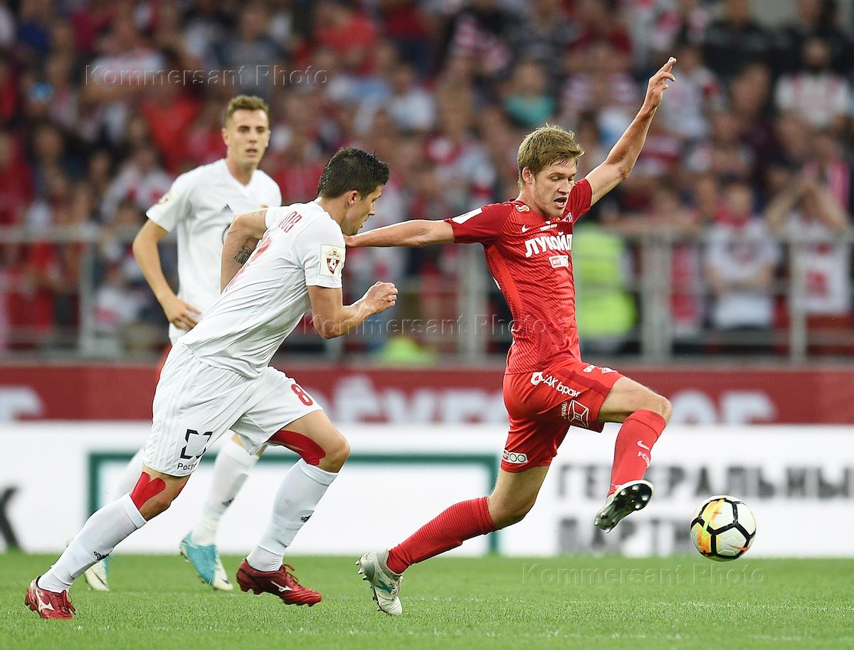Чемпионат России по футболу 2017/2018. 5-й тур. Матч между командами "Спартак" (Москва) и "Арсенал" (Тула) прошел на стадионе "Открытие Арена". Игрок команды "Спарак" Денис Глушаков (справа) во время матча.