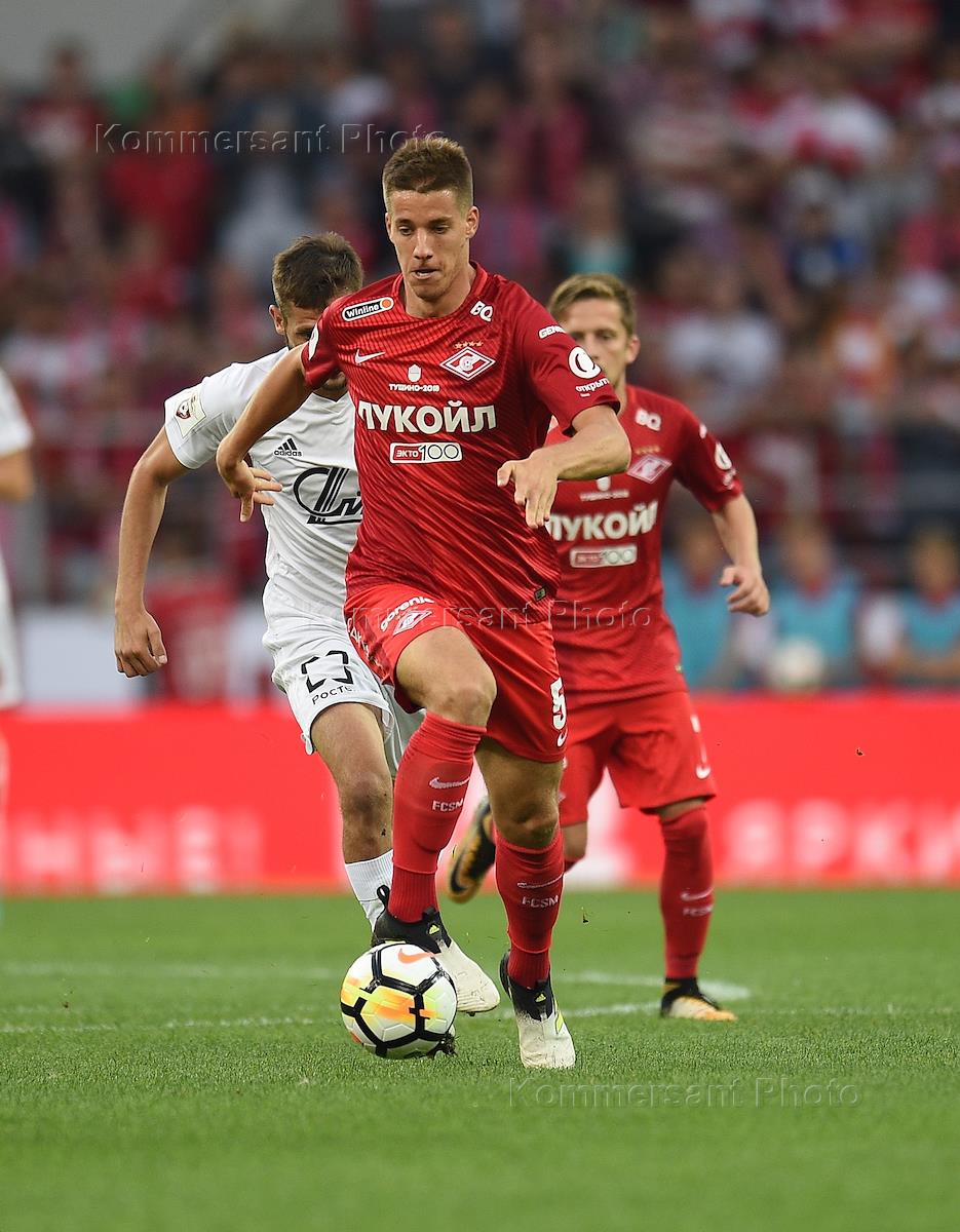 Чемпионат России по футболу 2017/2018, 5-й тур. Матч между командами "Спартак" (Москва) и "Арсенал" (Тула) прошел на стадионе "Открытие Арена". Игрок команды "Спартак" Георгий Джикия во время матча.