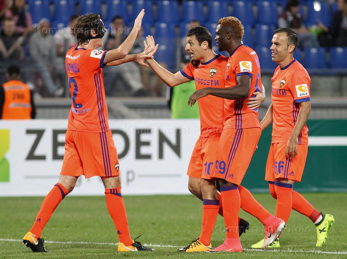 Чемпионат России по футболу, 5-й тур. Матч между командами "Тосно" (Тосно) - "ЦСКА" (Москва) прошел на стадионе "Петровский". Слева направо: игроки команды "ЦСКА" Марио Фернандес, Алан Дзагоев, Оланаре и Бибрас Натхо во время матча.