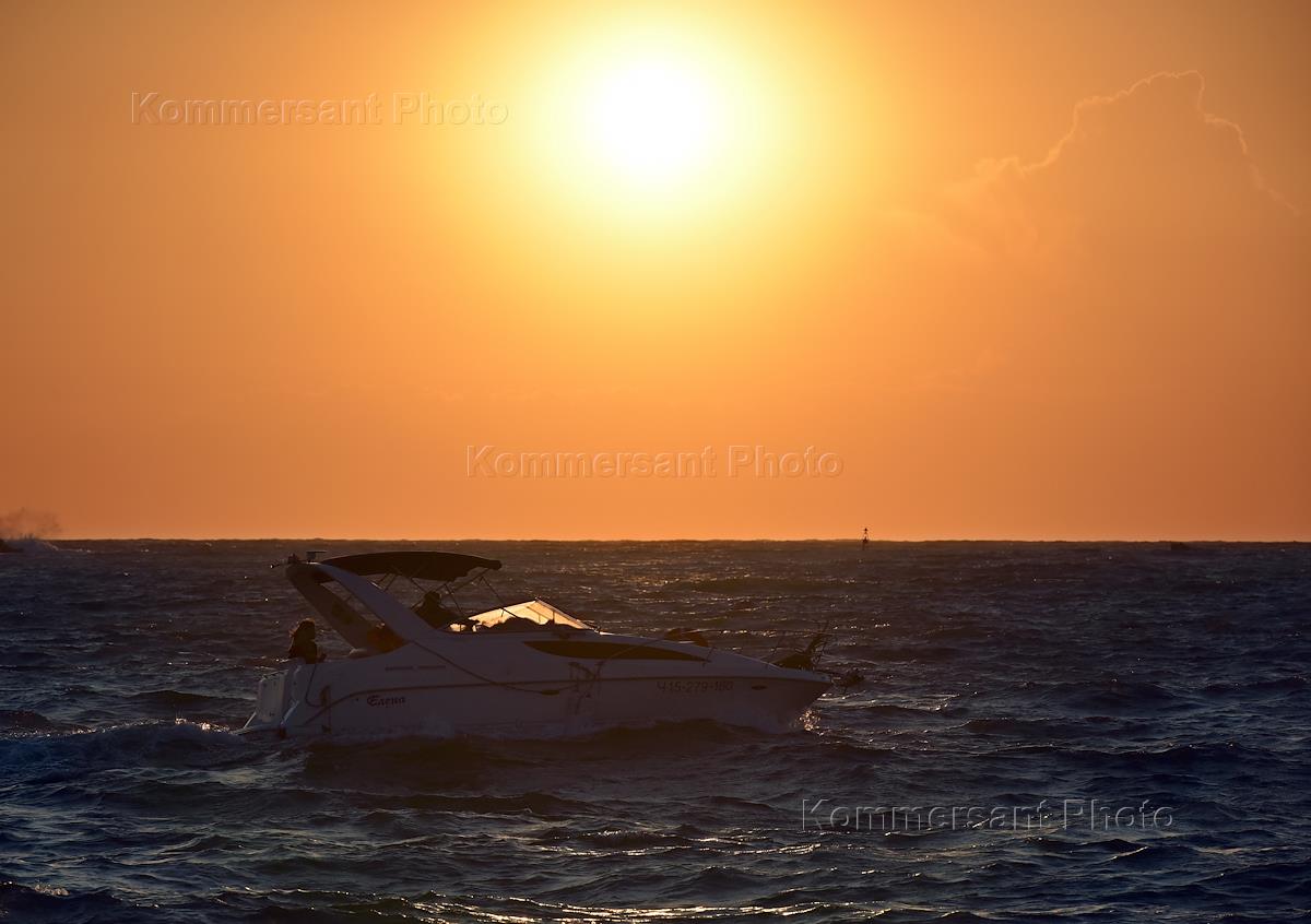 Жанровая фотография. Катер в море на фоне заходящего солнца.