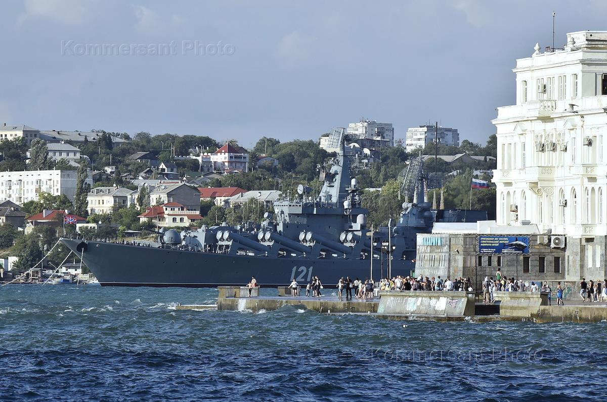Виды Севастополя. Военный корабль Военно-морского флота России в прибрежной зоне.
