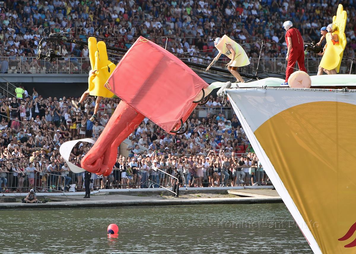 Фестиваль самодельных летательных аппаратов Red Bull Flugtag 2017 прошел на Гребном канале в Крылатском. Участники в костюмах российского рубля и арабского шейха во время фестиваля.